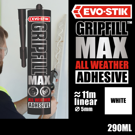 EVO-STIK GRIPFILL™ MAX adhesive is a multipurpose, high-strength grab adhesive with all the qualities of the trusted GRIPFILL™, but with no solvents, even more strength and its all-weather, moisture-curing Silyl Modified Polymer (SMP) formulation.
