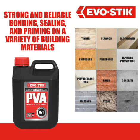 The highly concentrated solution can also prime and bond in a single coat, meaning you can get the job done faster. EVO-STIK Super Concentrate PVA is fast to dilute, and conforms to recognised British Standards BS 5270 & EN 204 D1 for plastering and woodworking.